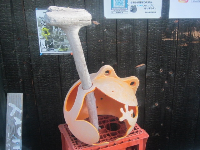 今回の直島の旅において、個人的に一番嬉しかったのは、こちらのお店に出逢えたことです。名前の通り、勿論普通の食堂として営業しているのですが、私は朝早い時間帯での訪問でしたので、まだ営業しておらず、中でお食事をすることはできませんでしたが、ここが素晴らしいのは、店内のレイアウトで、漁具として使用される浮球のリサイクルを目的とした、その名も浮球かえるさんのアートが店内の至る所にいらっしゃるんです!