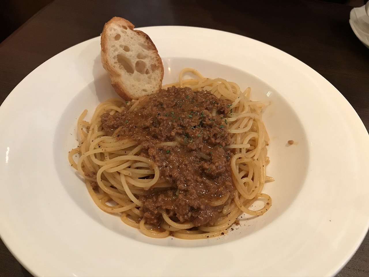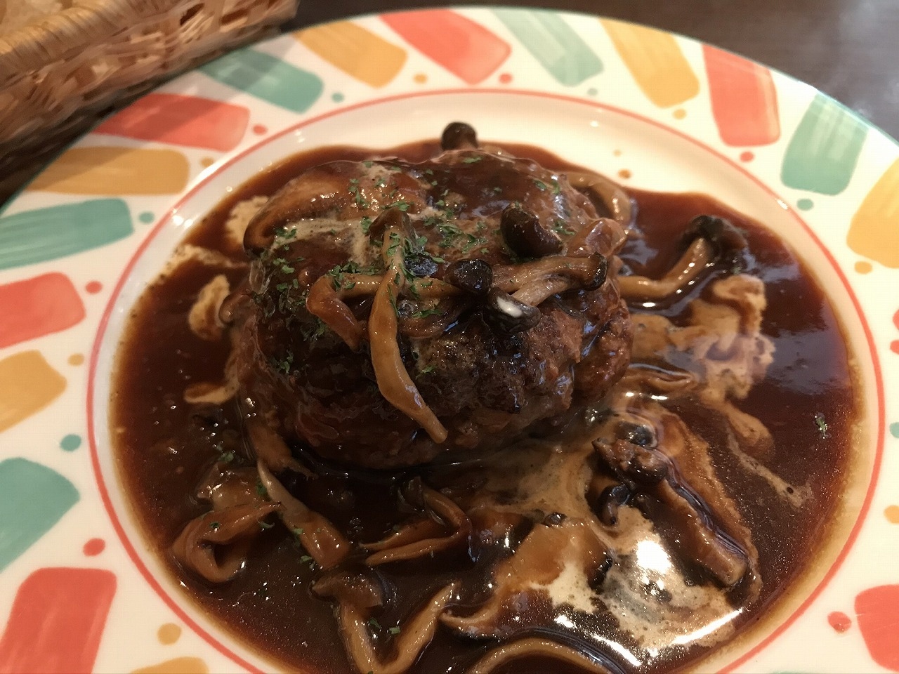 ランチで、きのこハンバーグとミートソーススパゲティをいただきました。