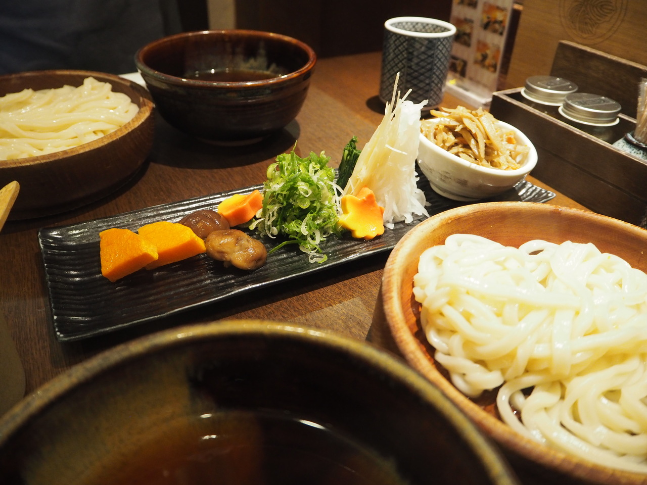 京都四条河原の人気店。開店直後に伺い、すぐに入れました。こちらのおすすめは、たっぷり薬味でいただくおめん。生姜や香味野菜、金平ごぼうなどを濃いめのお汁につけていただきます。最初は金平?とも思いましたが、これがうどんにあいます。思ったよりボリュームもあり、大満足のお昼でした。
