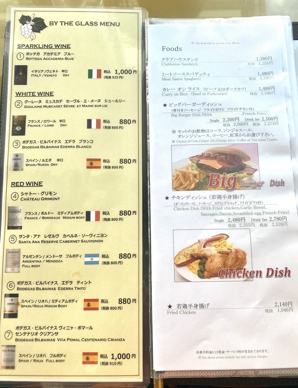 生ビールはS、M、L、メガの4種類あり、グラスワインも数種類あります