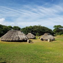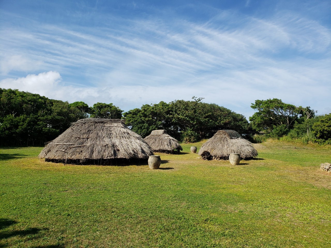 伊計島の中ほど、さとうきび畑の中にある遺跡。縄文~弥生時代の遺跡化と思いますが、瓦葺の竪穴式住居が数点復元展示されています。古代人がこの島でどのような生計を立てていたのか想像するとちょっと面白いですね。