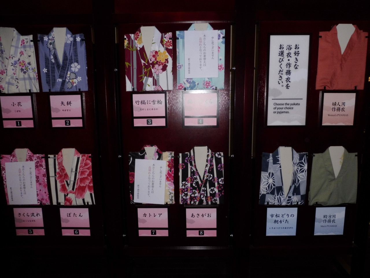 チェックアウトの時に壁に居並ぶ浴衣一覧を見て「男性も浴衣選べるなんて知らなかった」と後悔、一言案内が有ってもよかったのに!