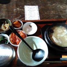 食べやすい参鶏湯が定食になってると娘に誘われました。ランチは定食形式でご飯は豆入りと白飯の2種類、食後にコーヒーや紅茶が付きます。参鶏湯のスープは癖がなく優しい味で鶏肉もすぐほぐれる柔らかさでした。スープが残るように食べてご飯を足して雑炊にしてもらいました。雑炊も美味しかったです。ランチは混んでるとのことで事前予約しました。キムチとご飯はお代わり出来るようでした。