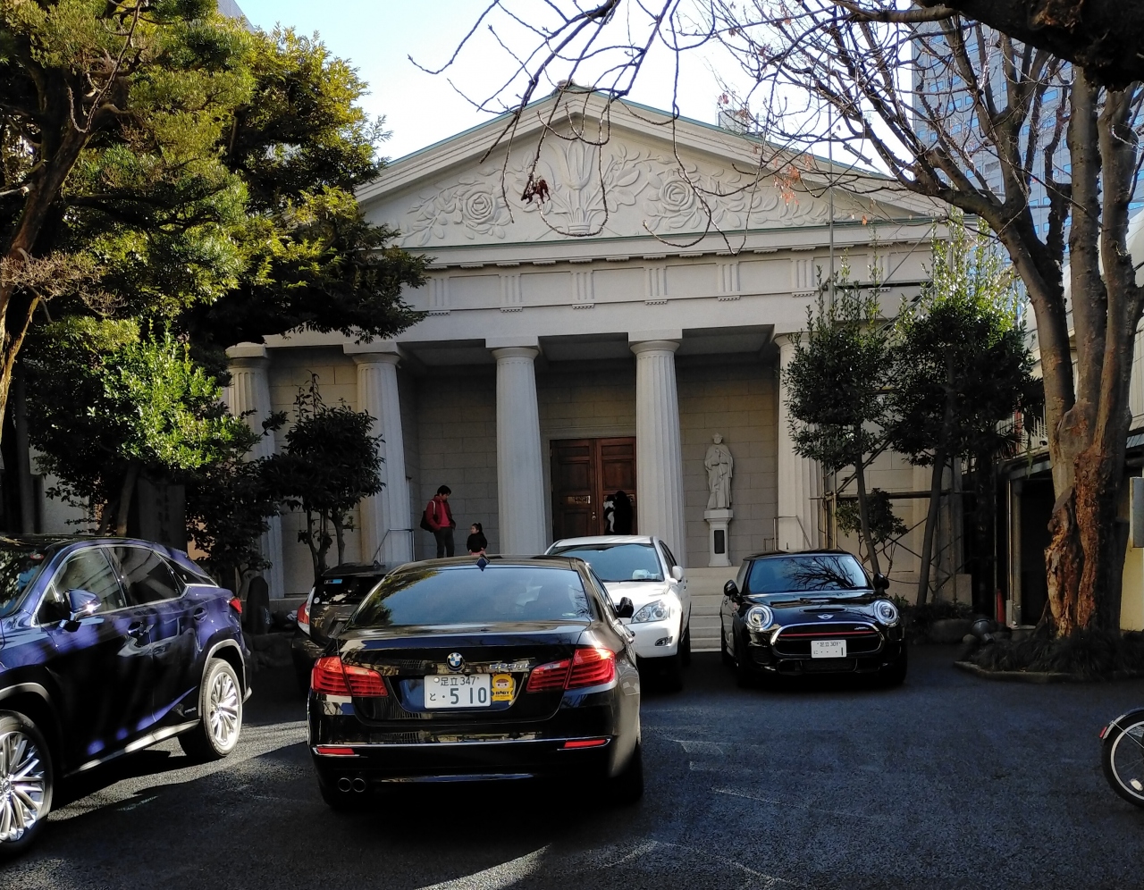 ここが外国人居留地だった明治の初めに宣教会のフランス人神父によりゴシック様式の赤煉瓦の教会が建てられましたが、関東大震災で焼失し、現在の正面にドリス式オーダーの並ぶパルテノン神殿風の建物が昭和2年に再建されました。これって一見石造りに見えますがモルタル塗りの木造建築なんだとか。