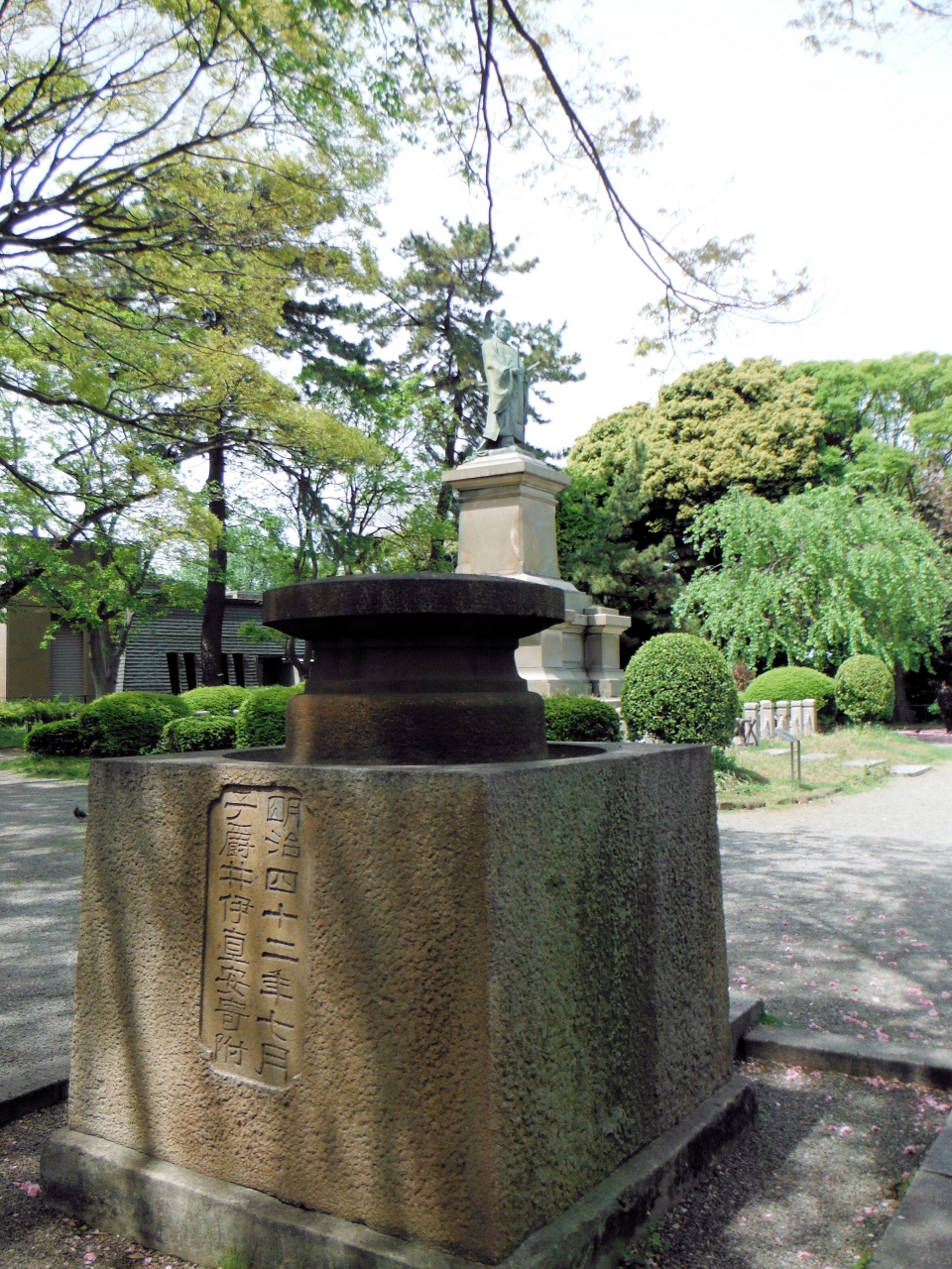 台座には建立明治42年(1909年)と刻まれていますが、戦時中の金属回収で撤去されたため、今の銅像は再建後のものです。