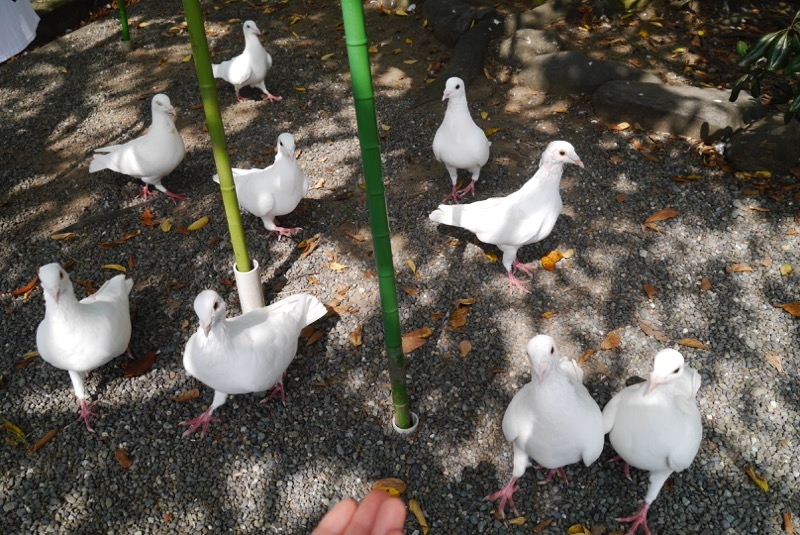 お世話された白いハトがたっぷりと暮らしている神社です。神社で管理されているそうで、とても人懐っこくてかわいいです。ハトが苦手な人からすると恐怖のエリアだと思うのですが、私のようなハト大好きな人にはこの世の楽園のように感じられると思います。とってもかわいいですよ。つやつやしてます。