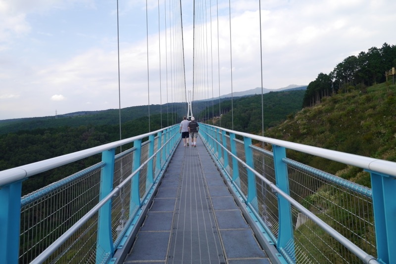 晴れ渡った空のような水色がアクセントの、人が通る用の吊り橋です。山の渓谷沿いにかかっていて、木造で…といった、よくイメージされる吊り橋と違って、しっかりとワイヤーでつくられた頑丈な吊り橋ですが、それでも風が吹くといささか揺れます。