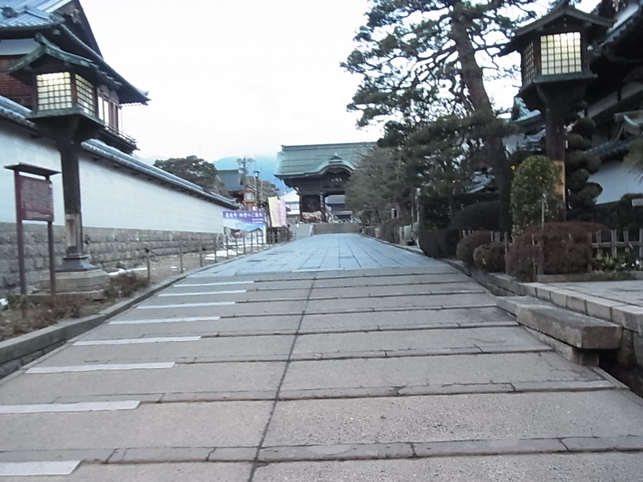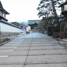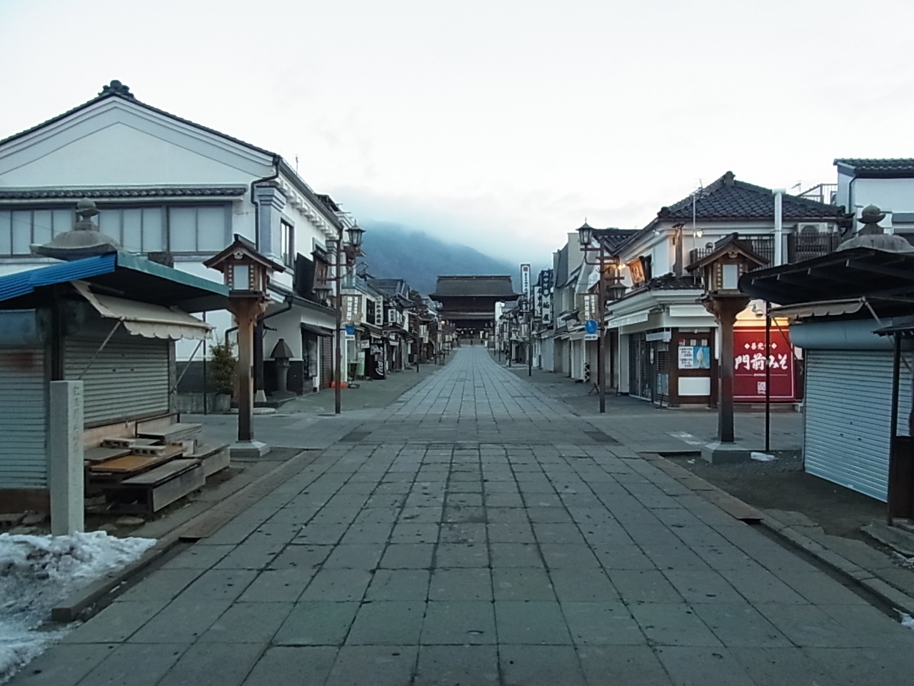 JR長野駅の善光寺口から徒歩25分ほど、長野市中央通りからつながる善光寺参道の石畳です。どこからが善光寺の参道になるのか?よくわかりませんが、石畳の向こうに見える善光寺が何とも言えず情緒がありますね。早朝は人も少ないのでオススメです。