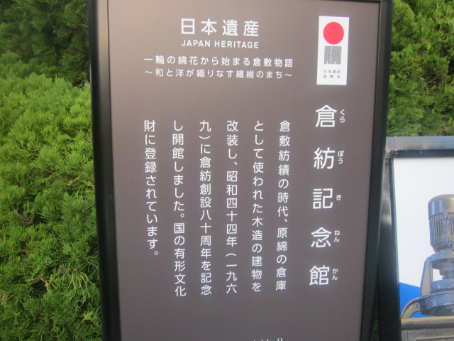 倉敷を代表する企業、倉紡の歴史を紹介する記念館で、現在はアイビースクエアとして整備されている美観地区の東側エリアの北口を入ってすぐ左手にあります。元々は原綿を補完する倉庫として使用されていた建物だそうですが、それを昭和四十年代、会社の創立80周年を記念して改装して記念館として整備したとのことでした。