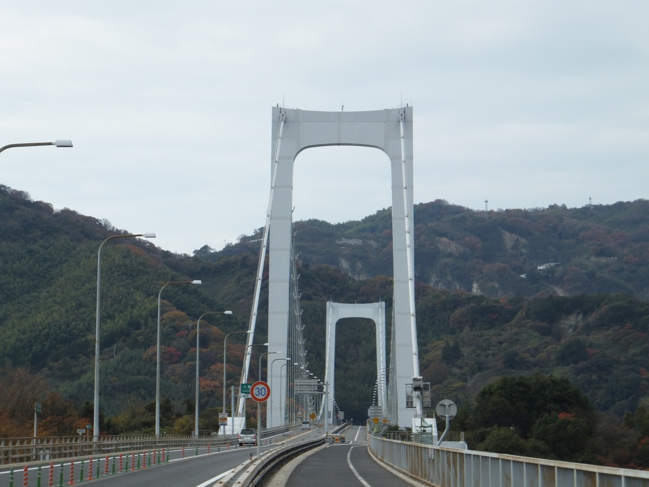 こちらの橋はやや地味目ですが、しまなみ海道を形成する7橋の内の一つで、見かけ景観ともに注目される存在です。国内では初の鋼箱桁を補剛桁に採用した吊橋で、補剛桁の設計や架設方法等の随所に新技術を採用したとのことです。夢のある話しです。景観は山がちで、それが特徴です。