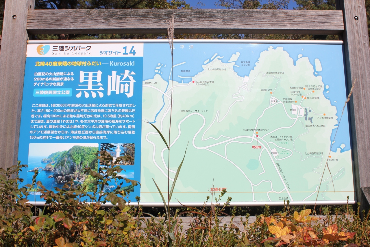 黒崎展望台目的で訪れましたが、一帯には黒崎展望台のほか、北緯40度のシンボル塔、黒崎灯台、黒崎砲台跡、カリヨンの鐘などの見所があり、整備された遊歩道で結ばれていて北山崎と並ぶ三陸海岸の景勝地となっています。