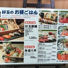 店頭には看板が置かれ、そこにはメニューが書いてあって、杉玉御膳(限定20食)舟盛り丼(限定20食)などがあり、杉玉御膳を注文しましたが寿司をメインに茶碗蒸しなど美味しくボリュームありです。