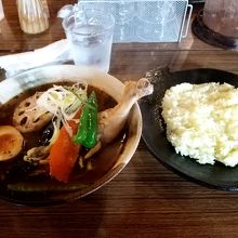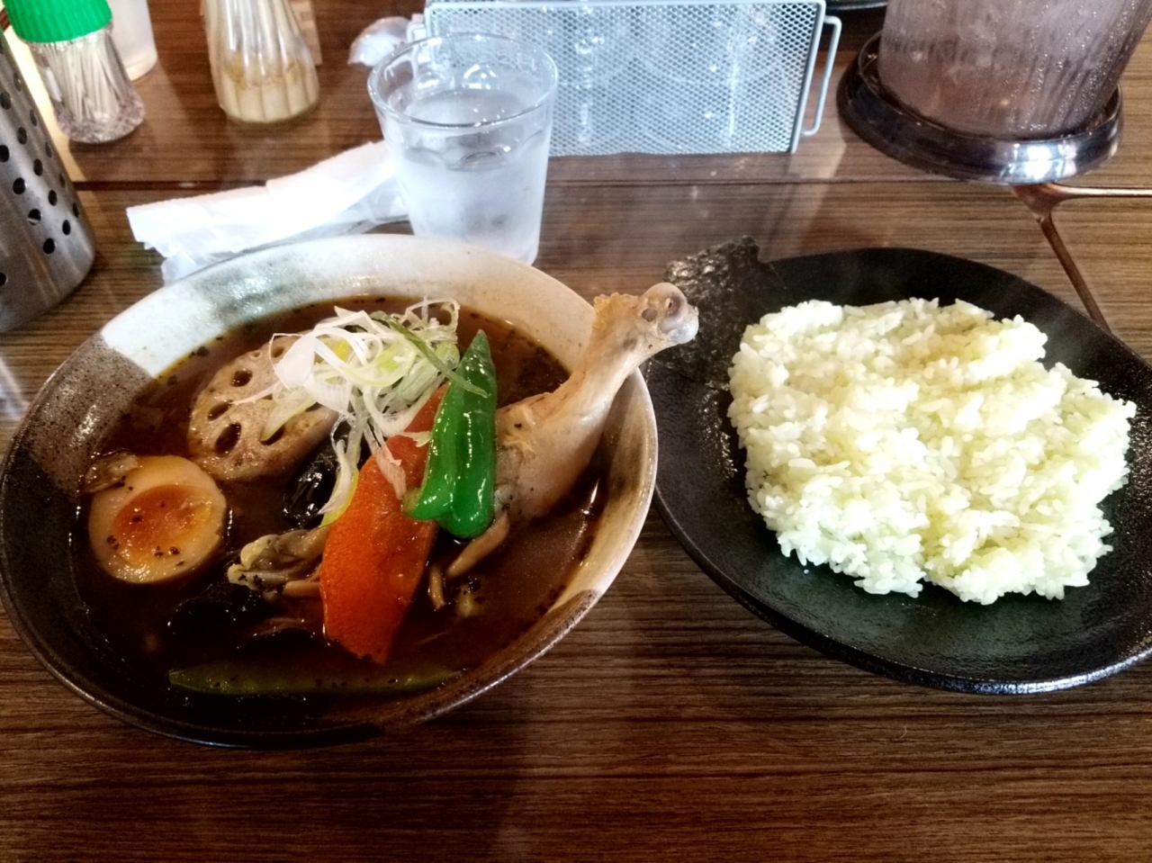 函館のスープカレーさきがけのお店ということです。店内は広くかなり座席数があるもののお昼時でほぼ満席でした。一番人気という鶏のメニューを注文。辛さは選べます。スープは意外にも和風で、ピリッとスパイシーというよりは奥深い出汁が効いた感じでした。