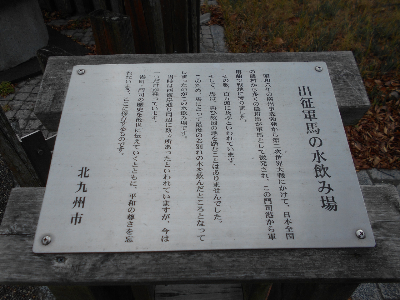 門司港駅の北西方で関門連絡船乗場前に建つ悲しい石碑。昭和6年の満州事変から第二次大戦まで門司港から中国大陸に100万頭もの農耕馬が軍馬として徴発されました。1頭も戻ることが出来内悲しい事件でした。水飲み場は数か所あったそうですが今はこの一か所だけとなっているようです。華やかな門司港の歴史にも悲しい場面がありました。