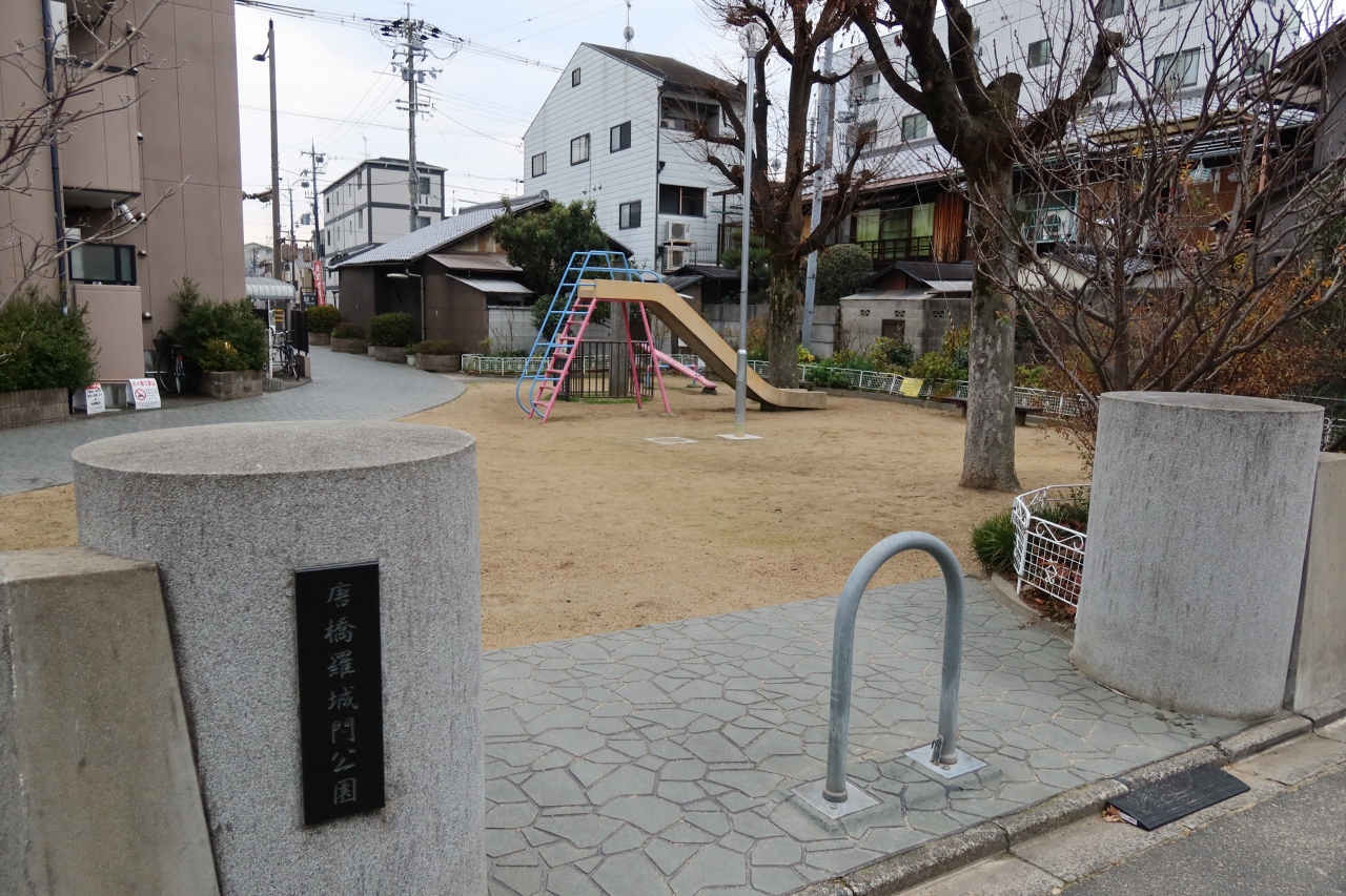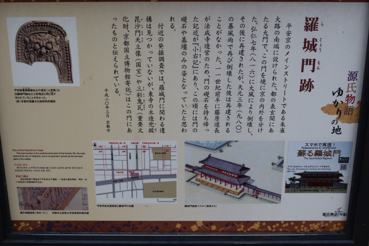東寺から九条通りを西に1km程行った九条旧千本交差点近くにある唐橋花園公園の中に羅城門跡の石碑があります。羅城門は平安京の正門で東寺と西寺の中央の位置し、ここから北に朱雀大路が伸びる平安京の重要な門でした。現在は柵に囲まれた石碑しかなく、わざわざ音ぞれる人も殆どいませんが、歴史上の重要な場所です。1回見れば十分です。