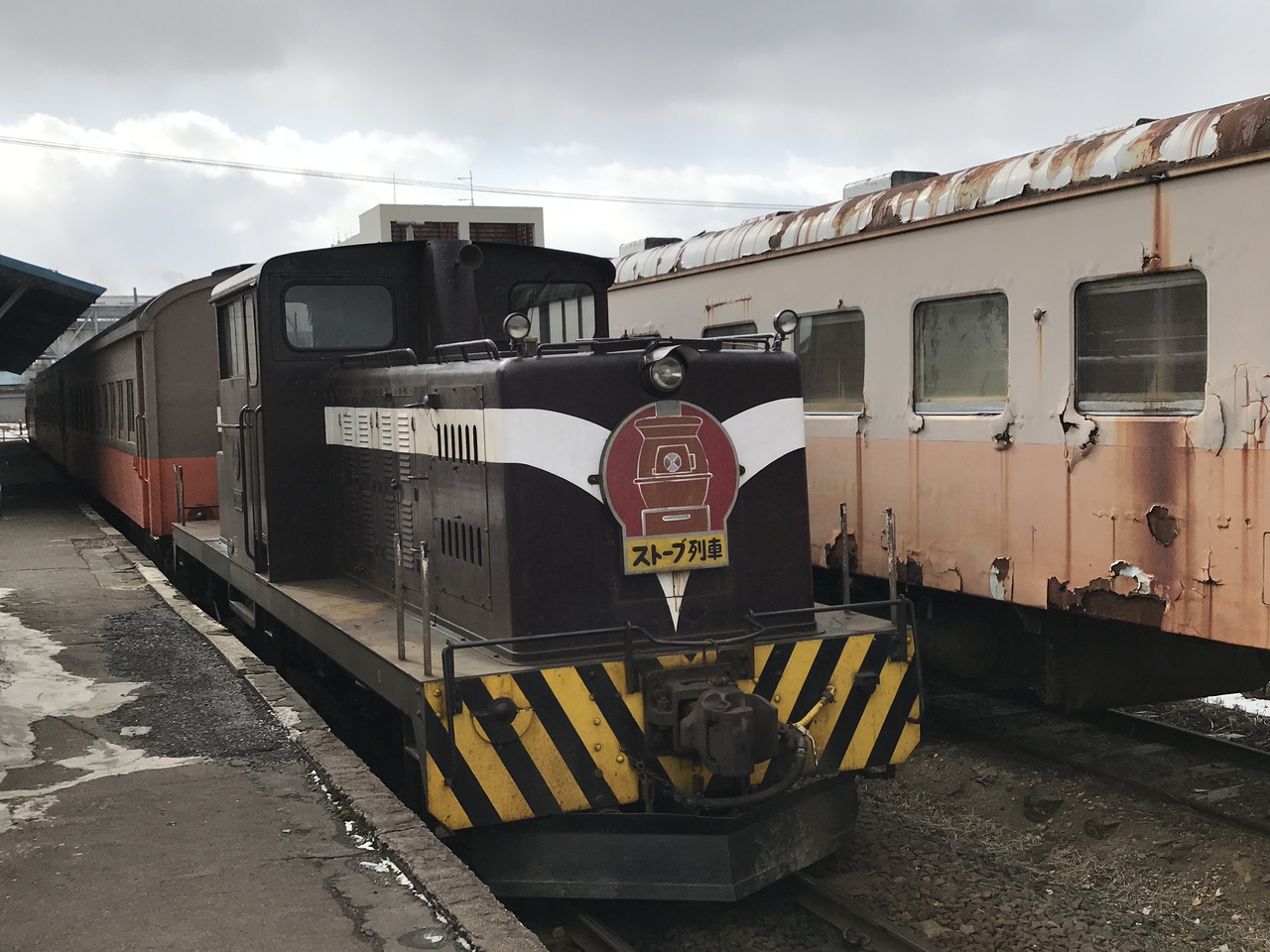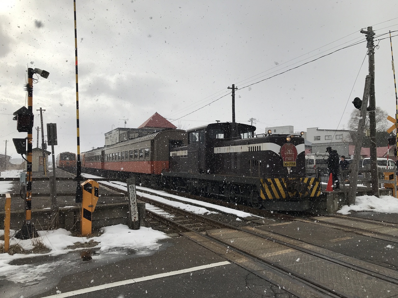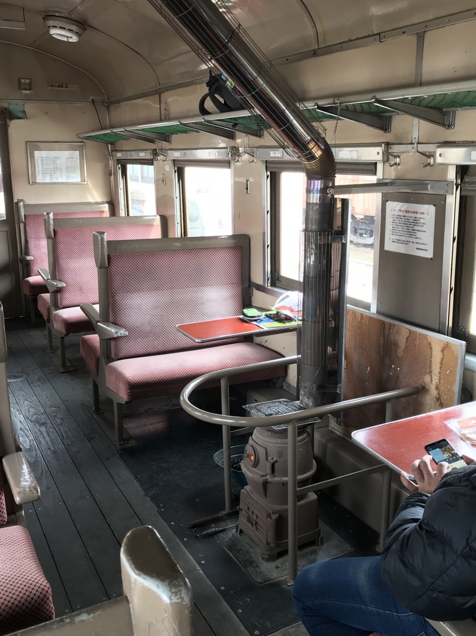 茶色い気動車がレトロな客車を牽引していきます。板張りの床に紐で編んだ網棚、高い天井で、子供の頃に乗った国鉄車両を思い出します。発車すると縦揺れ横揺れしながらゴトゴトと進み、窓から隙間風も入ってきて、昔にタイムスリップしたみたいです。アテンダントの方が乗車して、観光案内や、客が買ったスルメを見事な手捌きで焼いたりと大忙しですが、この方のおかげでよりストーブ列車旅が盛り上がります。この日は、桑田ミサオおばあちゃんの笹餅のご本人自らの販売があり、テレビカメラも入っていました。この日は雪は積もっていなかったので、次回は雪原を走るストーブ列車に乗ってみたいと思いました。