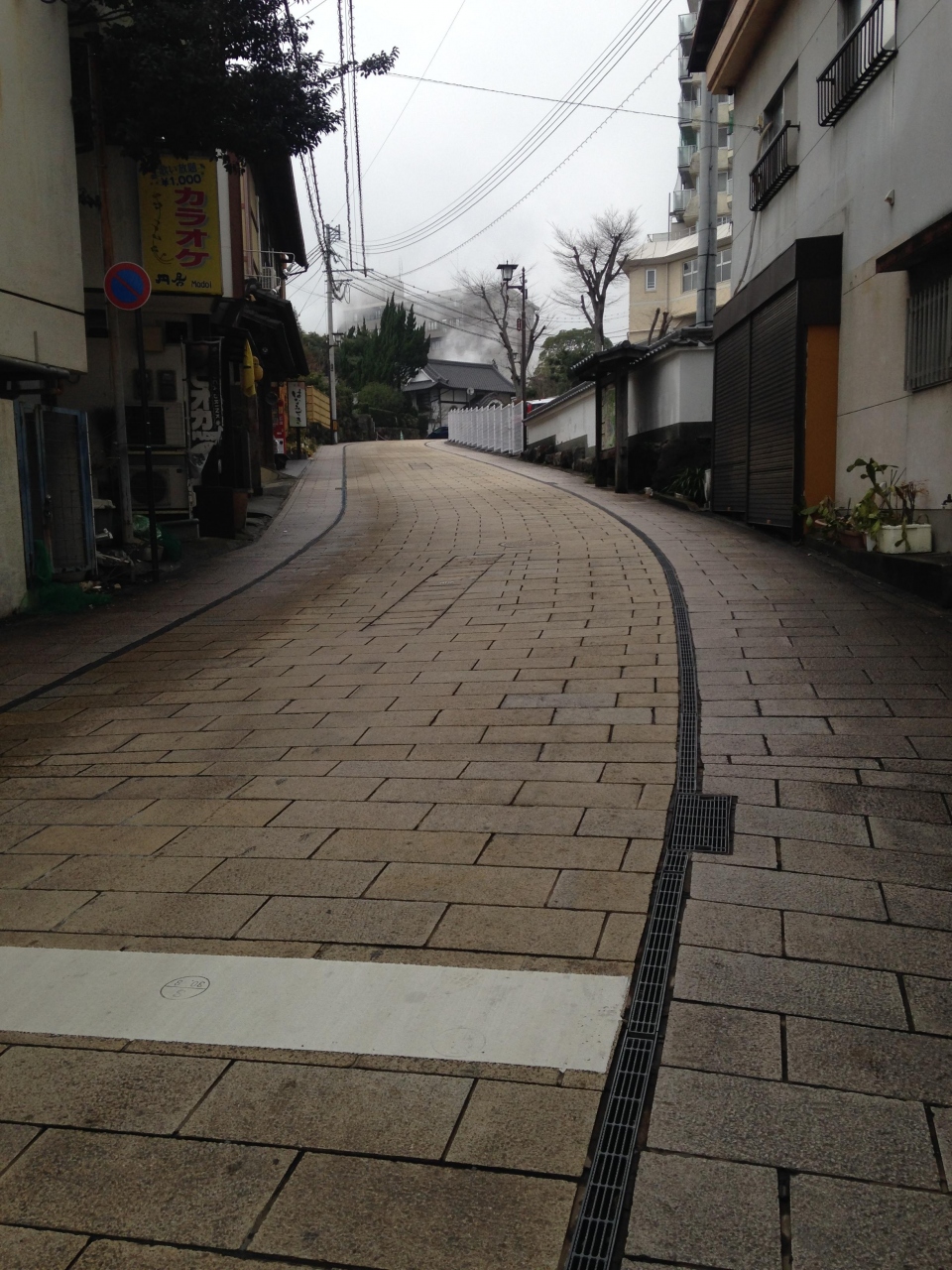 いでゆ坂から地獄めぐり通りまでの途中の通りです。鉄輪バスステーションから上っていくと白池地獄と鬼山地獄とかまど地獄があります。地獄めぐりをする観光客も多く歩いています。通りもゆとりがあり、歩きやすいです。