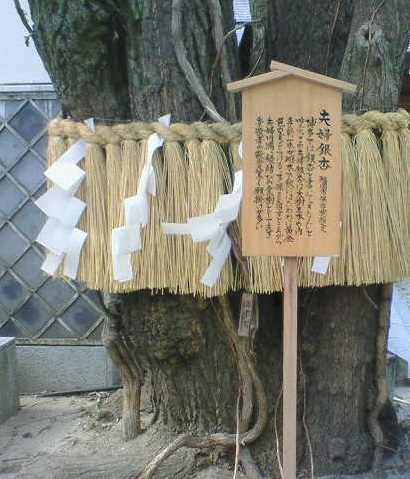 注連飾りで複数のイチョウの木が囲われていて、中に雌木が入っていて秋になると黄金色の実をつけることから縁結びのご利益を期待して信仰を集めているとのこと。