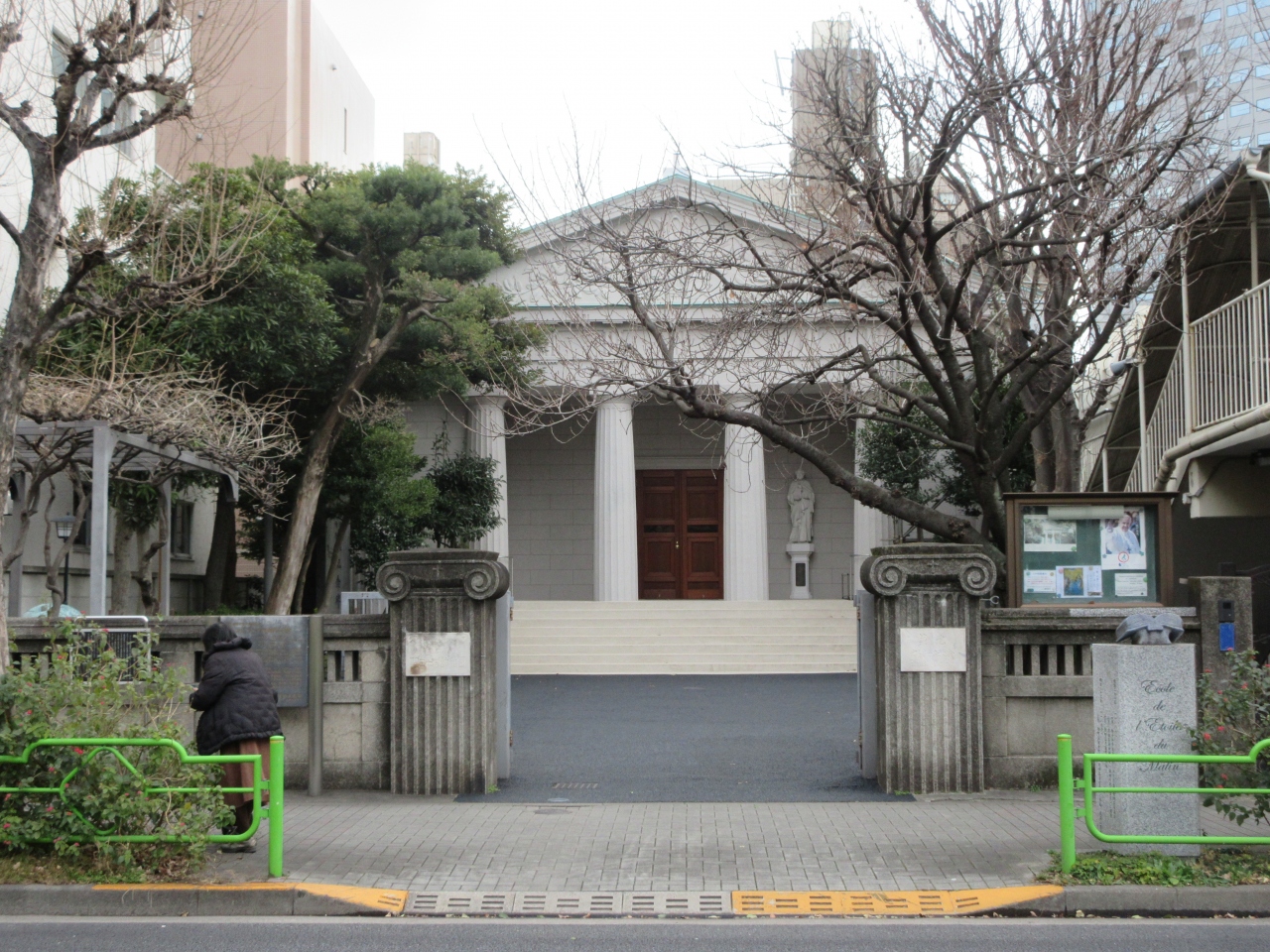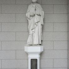 1927年に建てられた現在の聖堂は木造建築でモルタル塗りの珍しい建物です。訪れた週末午前、聖堂内に入り美しいステンドグラスを見ることができました。両サイドの黄色と白のステンドグラスから明るい光が堂内に入り、正面の黄色いステンドグラスに描かれた葡萄のつると葉が印象的でした。旧聖堂内にあった四聖人の中で大震災後に残った唯一の聖ペトロ像が聖堂入口に立っています。白く塗りなおされた珍しい聖堂は目をひきますが、堂内のステンドグラスに魅力を感じた教会でした。