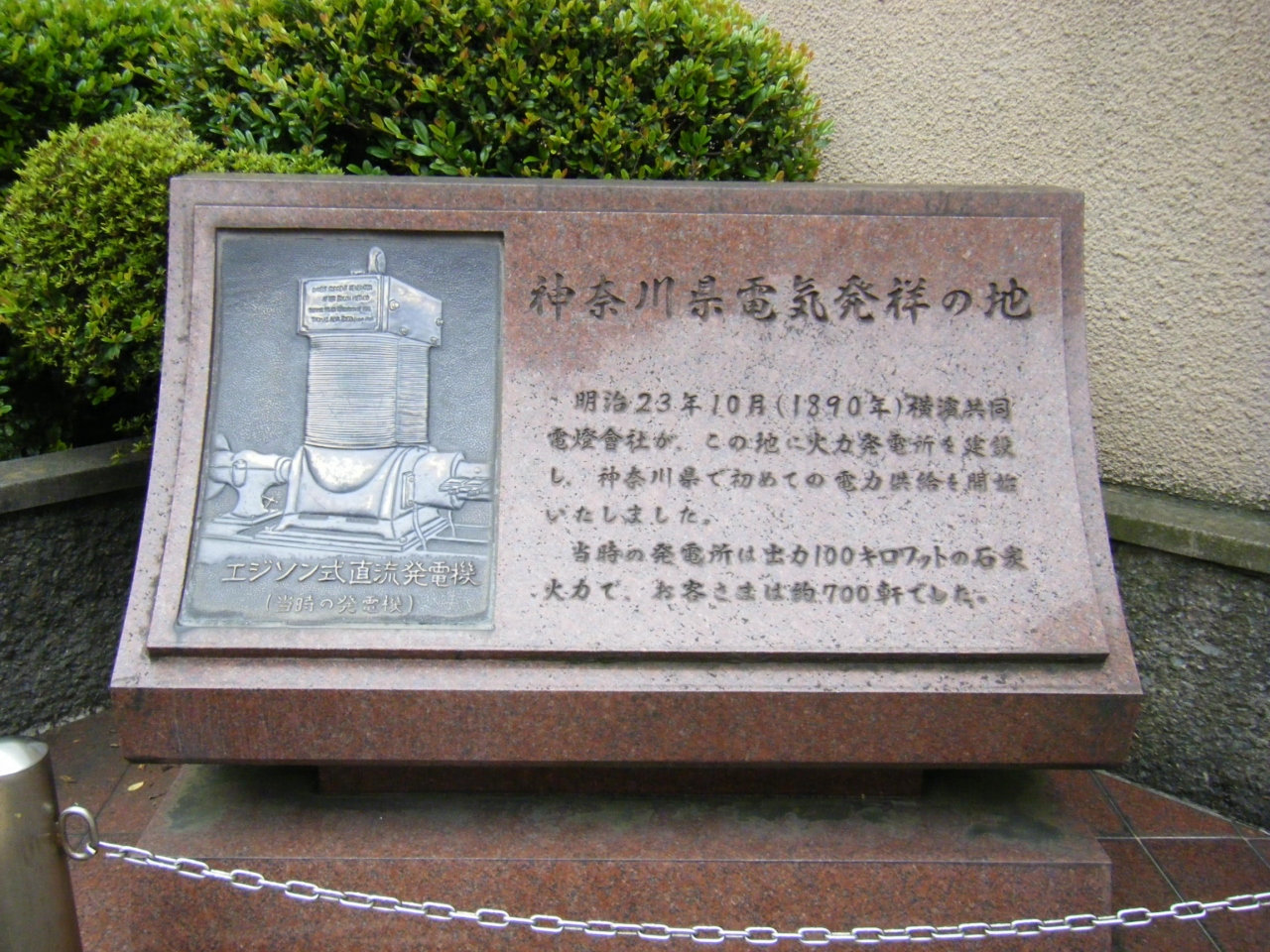 2019年7月に横浜駅周辺~みなとみらい地区にかけて散策した際に立ち寄りました。神奈川県電気発祥の地碑は横浜スタジアムの近く、ベイスターズ通り沿いにあります。1890年にこの地に石炭火力発電所が造られたのが始まりだそうで、当時は僅か700戸に電力を供給していただけだったと書かれていました。当時のエジソン式直流発電機も描かれており、なかなかお勧めの史跡です。