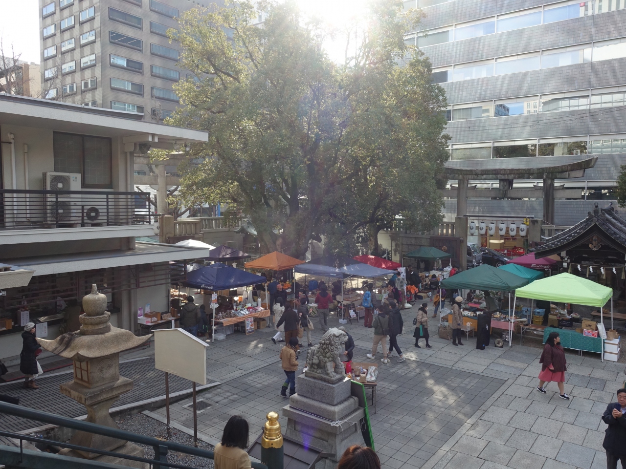 宿泊ホテルから近かったので、朝食後の散策で足を運びました。御堂筋にも近い都心のど真ん中にある歴史ある神社です。新年2週目の週末でしたが、まだ正月の賑わいがあり、仕事関連と思しき大勢の参拝客と、屋台の姿もありました。とても活気ある光景でした。