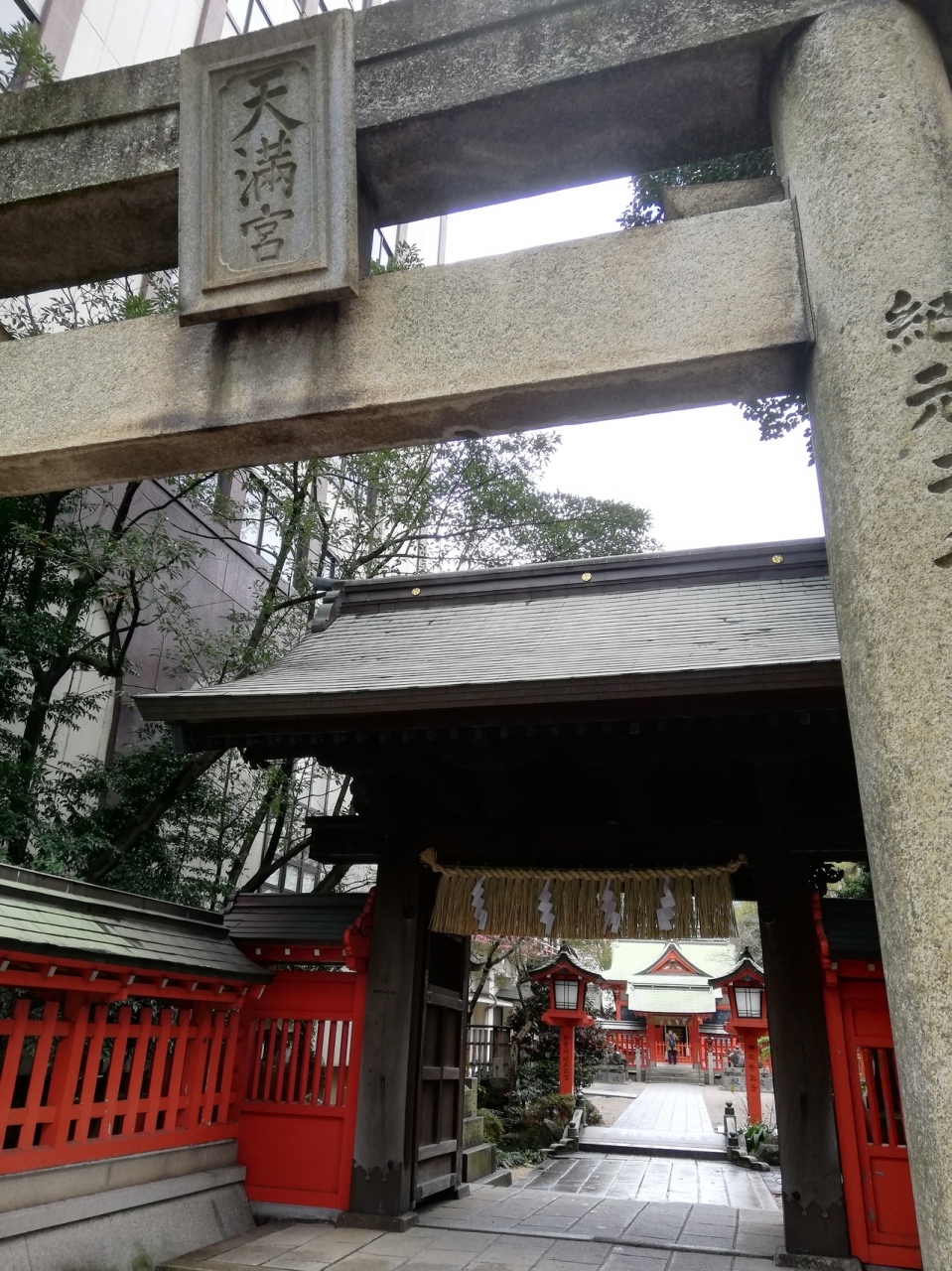 福岡の中心的な街である天神の一角にある神社です。ファッションブランドが入る大きなビル群の隙間にたたずむ小さな神社ですが、朱塗りで美しく、神秘的な場所と言えます。学問の神様が祀られているので、多くの受験生がいました。