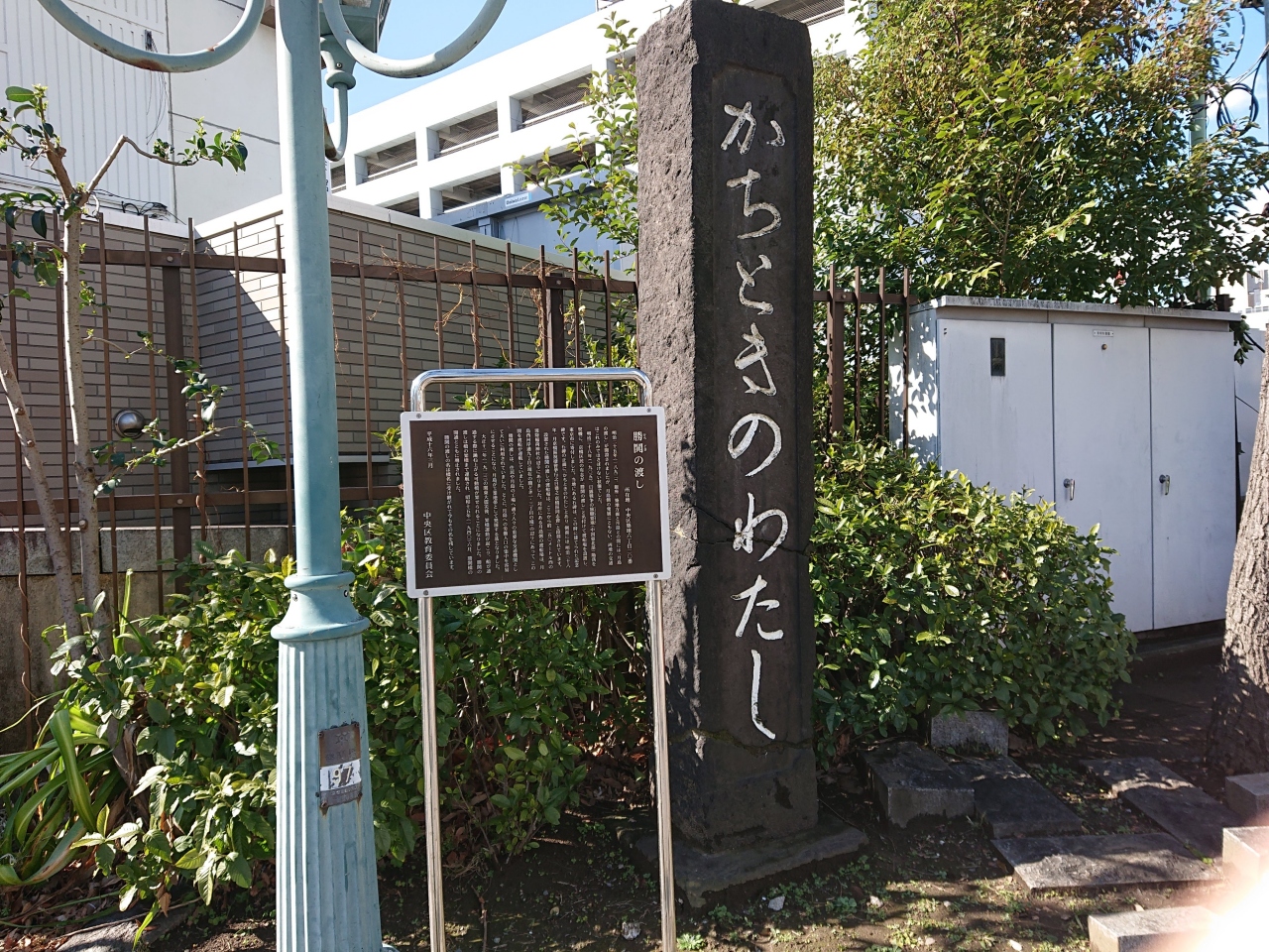 かちどき橋の資料館の前にかちどきの渡跡という碑が建っていました。説明文によるとかつて、築地と月島間には月島の渡しと呼ばれるものがあったが、月島川の発展に伴いさばききれなくなったと。