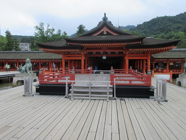 厳島神社で海に向かって本殿の真正面にあるのが平舞台です。本殿前にある高舞台より海側にあり、海に突き出た火焼前(ひたさき)大鳥居をバックに写真を撮るのが定番。アジア系観光客の皆さんにより、永遠の撮影会が続きます。1176年、平氏一門が供養を行ったなどの歴史も残っているようです。面白いのは、平舞台を支えているのが石の柱。社殿などは木の柱が使われているとのことでした。毛利元就が寄進したとか。