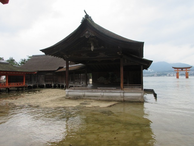 厳島神社に参拝し社殿でお参りを済ませ、出口へと向かっていくと、右手海側に舞台のような建物が見えます。これが、日本で唯一海に浮かぶ能舞台です。最初に寄進したのは当時の広島藩主の福島正則。現在の舞台は、明治維新まで藩主を務めた浅野氏の寄進と、歴史的な名前が出てきます。重要文化財です。とはいうものの、人生で何度も厳島神社に行きましたが、この能舞台で何かが演じられるのを見たことはありません。ニュースでも記憶ないけど、どういうときに使われるのかしら。
