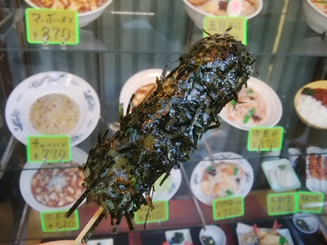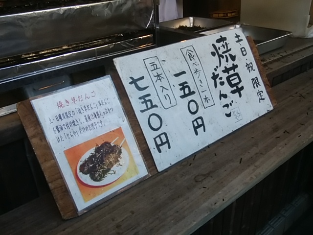 草餅を焼いて、醤油つけて、刻みのりの海にぐる~んとひと回しして渡してくれます。柔らかいおだんご。よもぎの香りはあまりなかった。