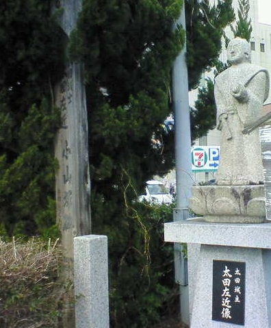 「太田城主 太田左近像」とある小さなお侍さんの石像で、隣の説明板には氏に関する歴史などが詳しく書かれていました。