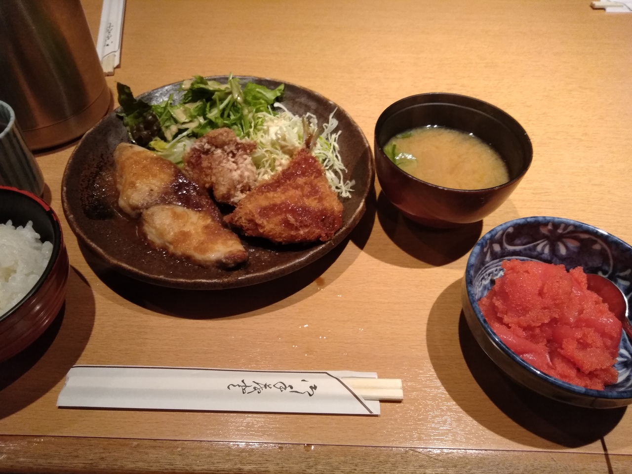 鰤ステーキにしました。本日のフライ(アジ)と唐揚げがつきます。さらに、びっくりな明太子食べ放題!これは嬉しいー!白いご飯が進む!