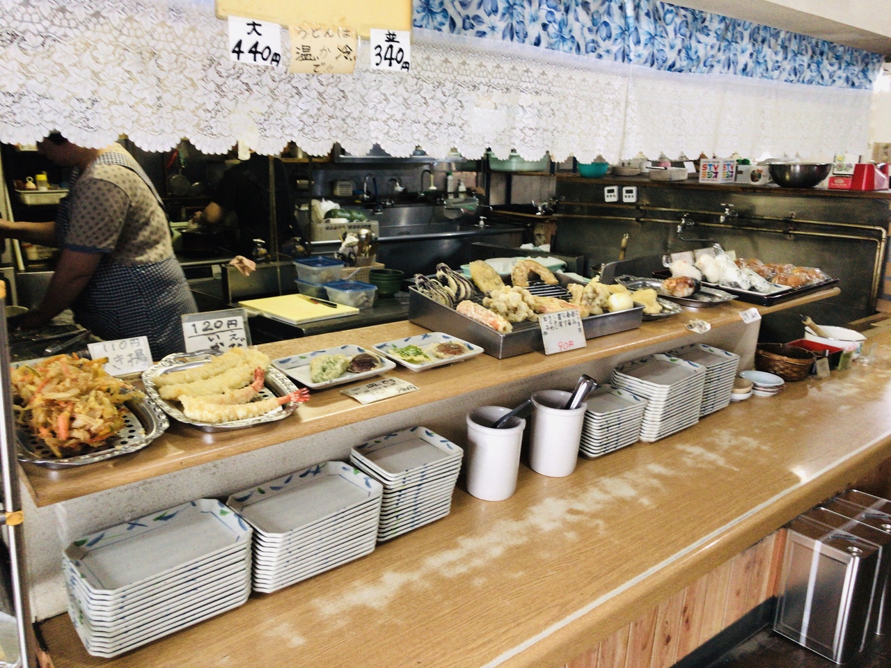うどんは温かい、冷たいから選べて大¥440、小¥340。
