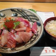 海鮮丼ぶりはいろいろなネタが入っており、様々な味が楽しめる。ご飯は酢飯だが酢の濃度が濃い感じで、ちらし寿司のご飯のような印象をもった。