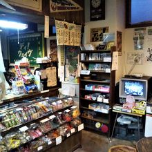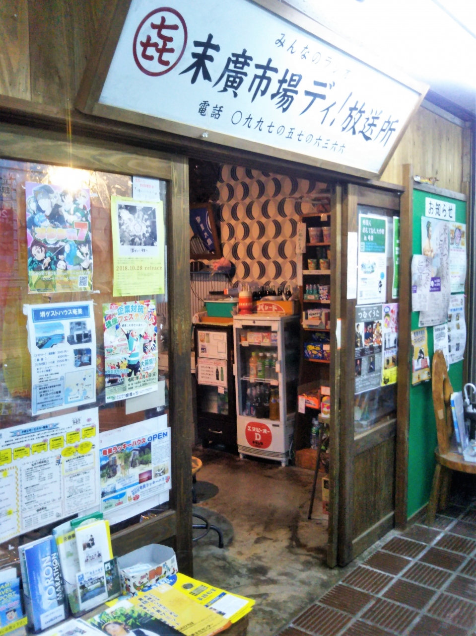 超レトロな末広市場に入って行くと中ほどに駄菓子屋さんがありました。中を覗くと懐かしい看板や冷凍ケース、更にブラウン管のテレビなどがあり、まさに昭和の駄菓子屋を再現した雰囲気。観ているだけで楽しめます。店内にいた人に聞くと、お菓子は売っているようですが「本当はここミニラジオ局です」と。確かにガラスで遮られた先にはコンパクトなスタジオが。ここはミニFM局だったのか、ビックリ。
