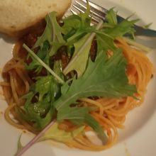 デザート付きの前菜盛り合わせと、スモールサイズのパスタのランチ(950円)を選択。コーヒーはセルフで。