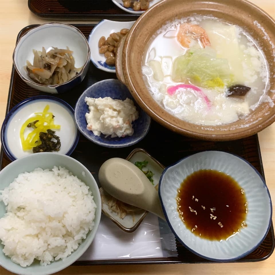 温泉水で煮るのでとろとろにほろほろになるのだそう。そんな定食というか御前をいただいてみた。小さい小鉢がお豆腐のそばにぎっしりと並ぶ。たんぱくな豆腐に対して、しっかりあじのついたおかず類のおかげでおいしくいただける。