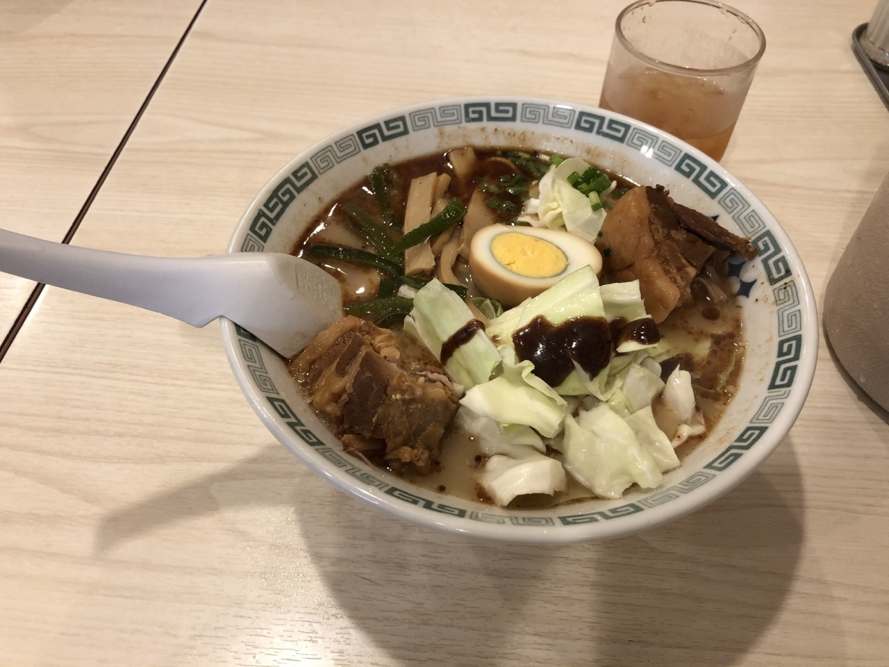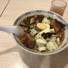太肉麺が看板メニューで、角煮と生キャベツ、茎わかめ、煮卵が乗ります。