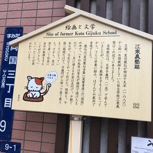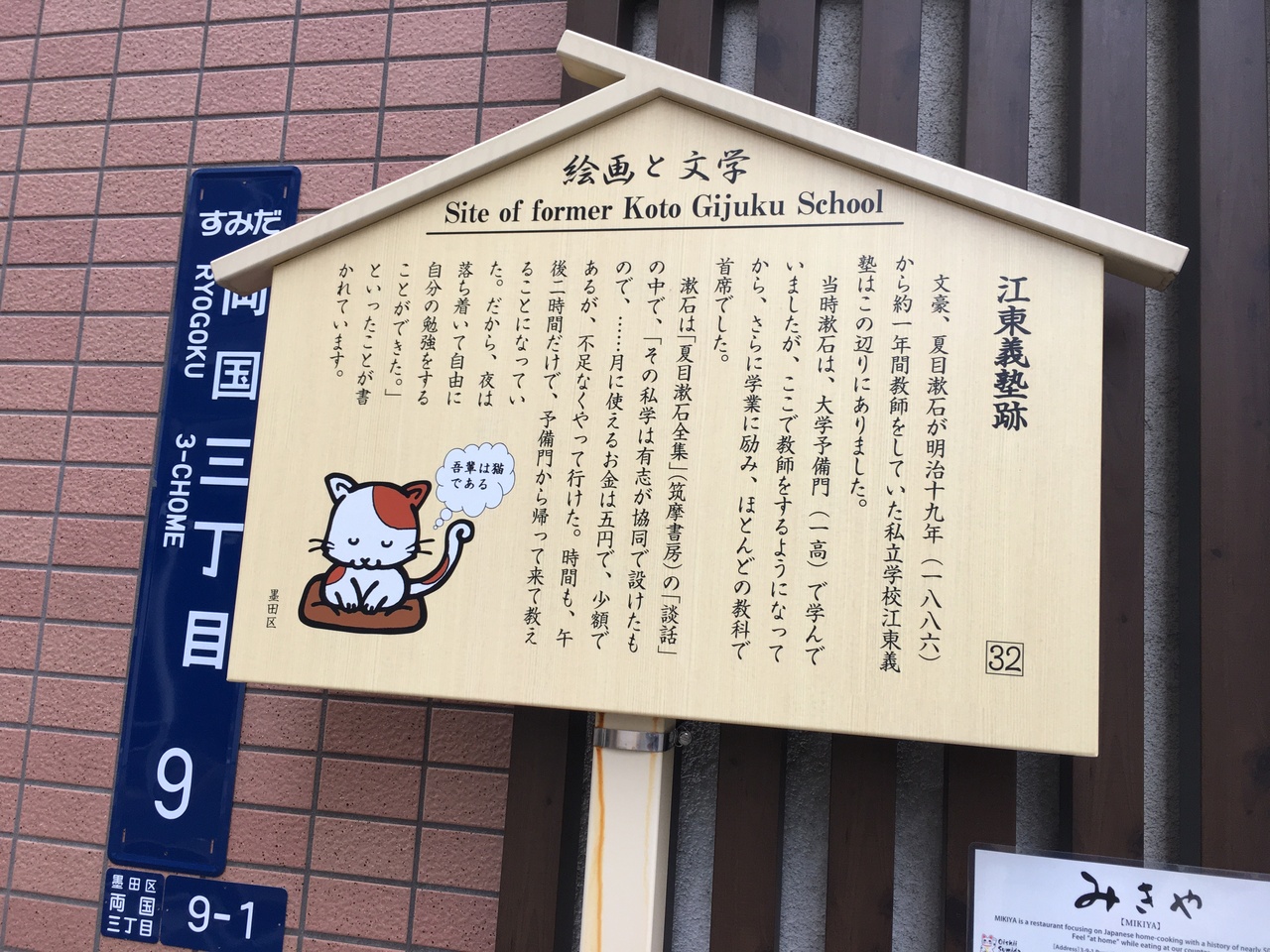 両国の吉良邸裏門跡の近くで、何でもないビルの脇に案内板がひっそりとありました。何のことかと案内板を読んでみると、かってこの地に江東義塾という私立学校があり、その頃に一高の学生だった夏目漱石が、ここで1年ほど教鞭をとっていたという歴史があるそうです。 案内板も綺麗でまだ新しいですが、それに対して江東義塾跡に関するものは何も残されていません。