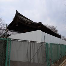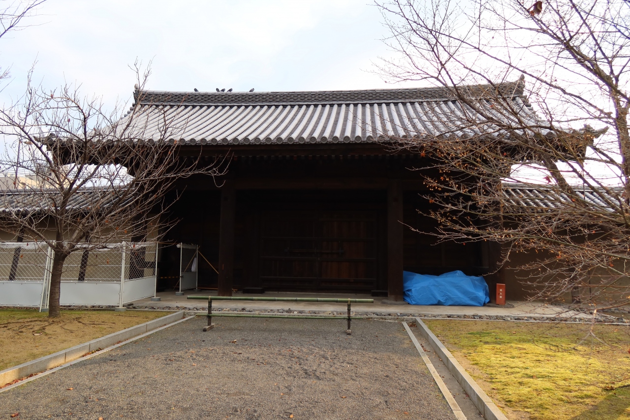 東寺の境内の南東部、大宮通りに面した所にある門が東大門です。一番五重塔に近い門がこの門です。この門は新田義貞の攻撃に門を閉ざしたことから不開門と呼ばれており、現在も閉じられたままですが、大宮通りからは更に工事フェンスに囲まれて外部からは殆ど見られません。境内側からは閉じられた門がしっかり見られますが、あんまり観に行く人はいませんでした。