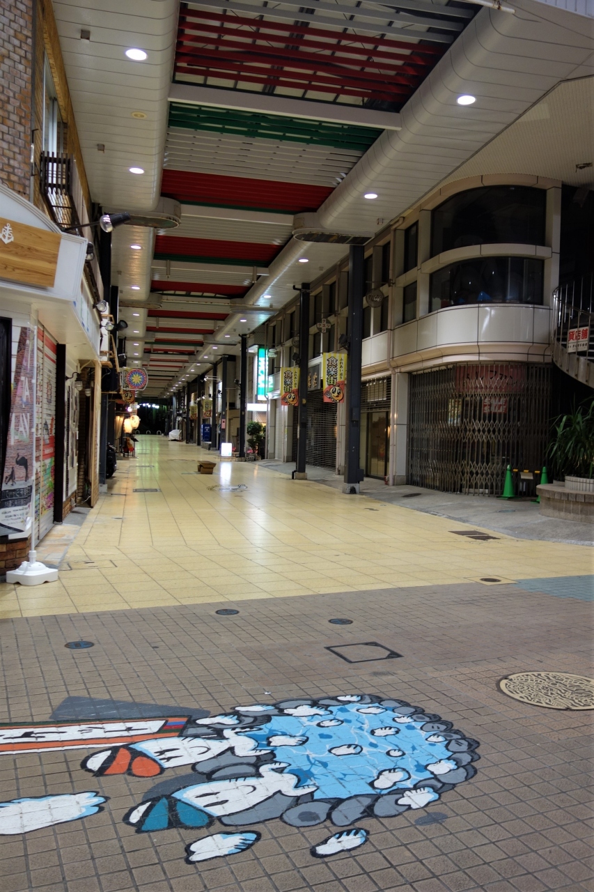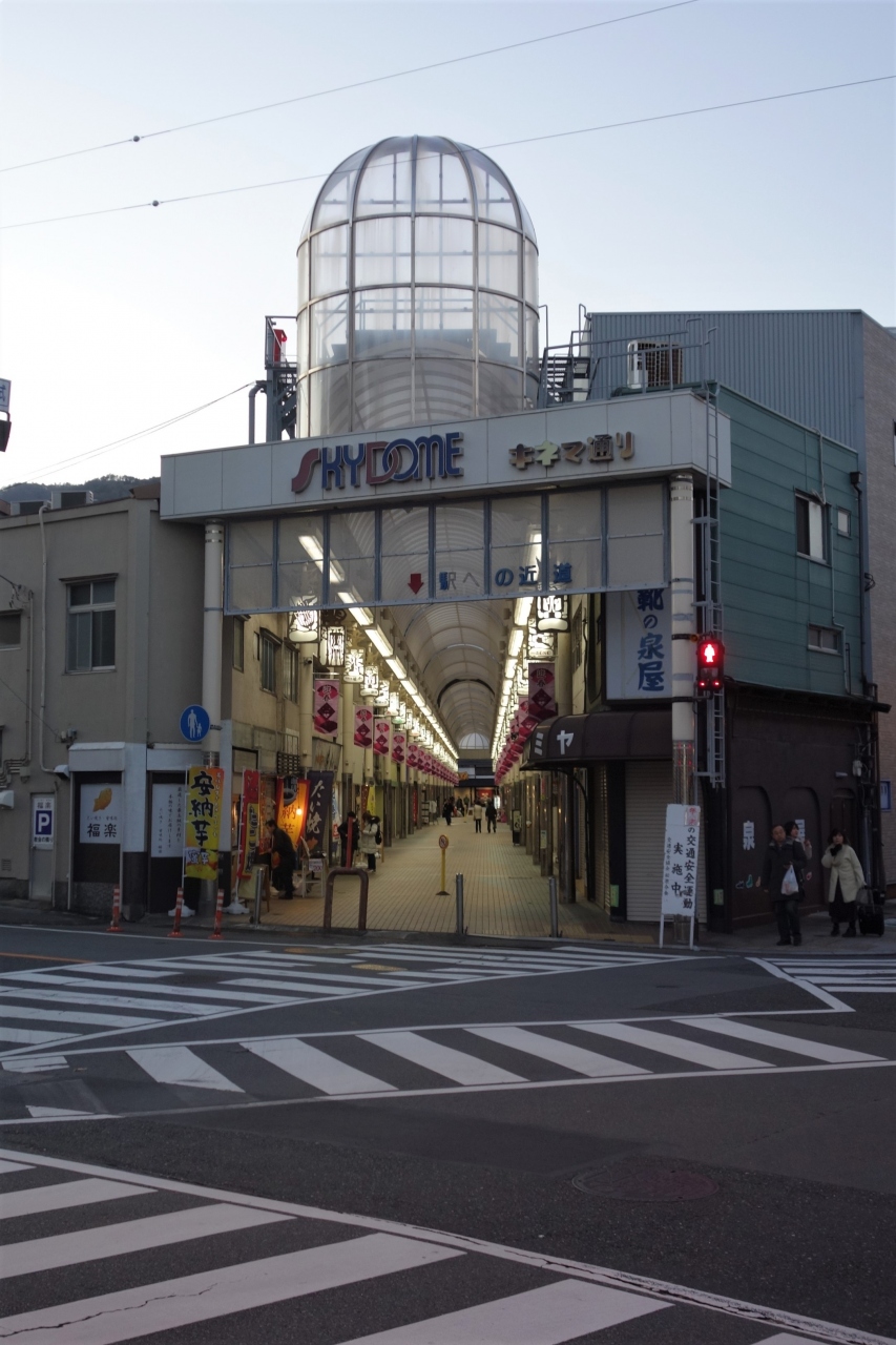 駅前、改札を出たら正面やや右に湯の花通りの入口が在ります。道は広くありません。お店がズラリと並んで、ぶらぶら歩くのは楽しいです。湯の花通りが終わると、道を渡ってアーケード街が始まり、其処がキネマ通りです。こちらにも沢山のお店が在ります。