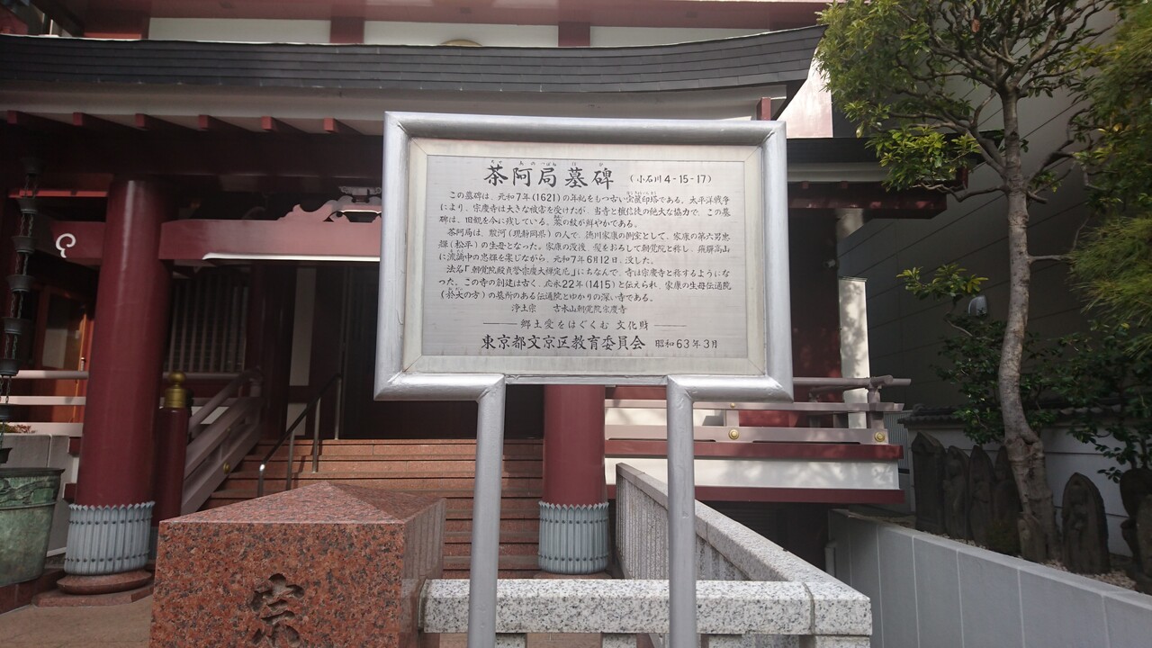 小石川の吹上坂の坂下付近に徳川家康の側室である茶阿局が眠っています。吹上坂沿いの宗慶寺にお墓があり、入り口には説明板が立てられているので、すぐにわかりました。松平忠輝の母で、数奇な運命をたどった女性であることを初めて知りました。