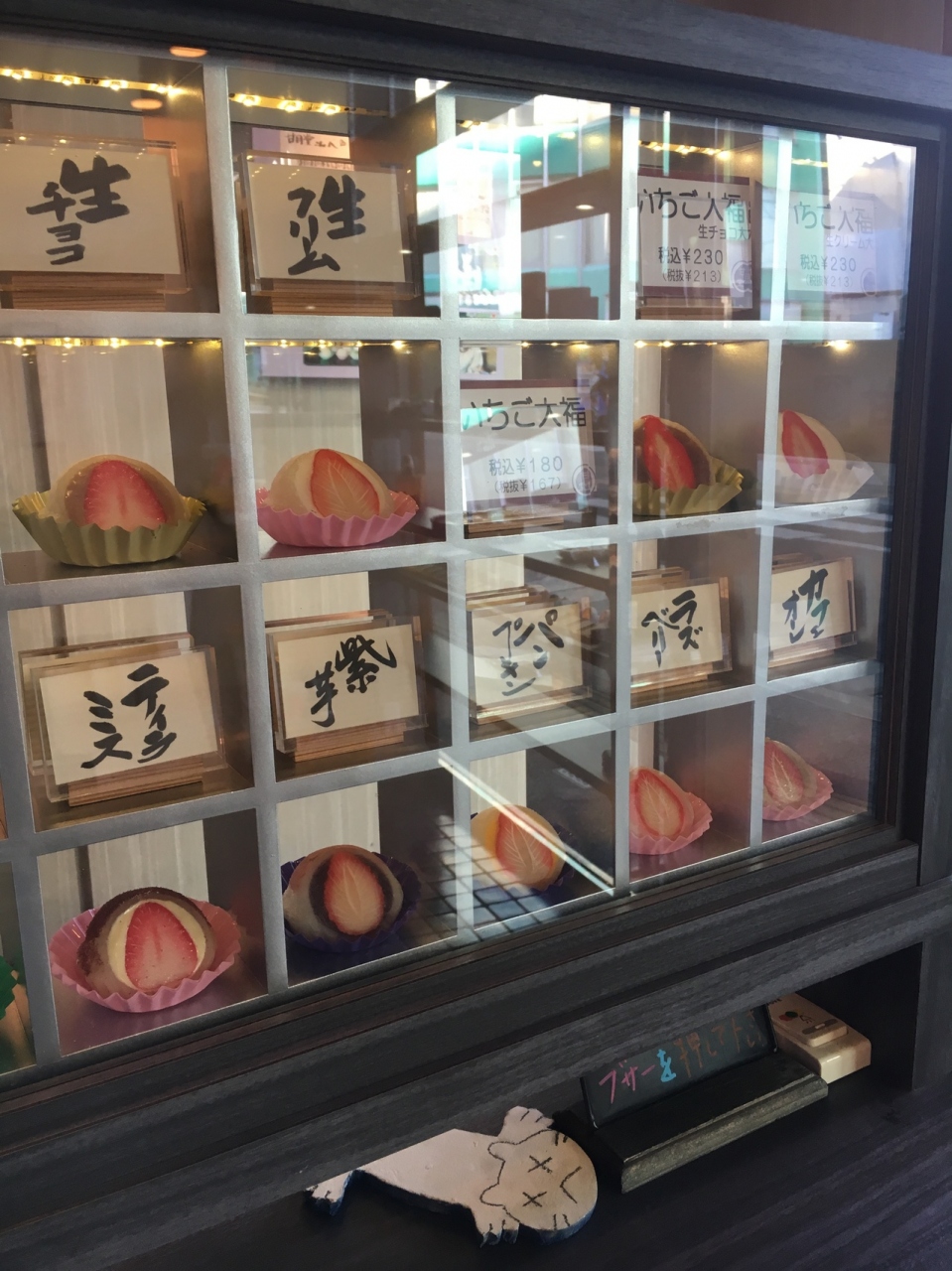 丸亀駅を降りてお城側に出たところにある浜町商店街にお店はあります。店内に入るとかなりの種類の大福が並んでいます。これだけ種類のあるお店は見たことがないレベルであります。よくあるものから、変わり種のものまで揃っています。カスタードクリームの入ったイチゴ大福を購入しました。