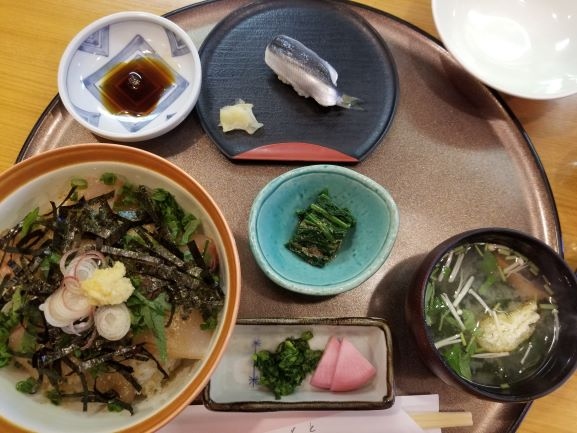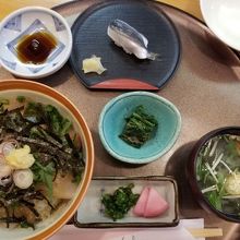 さわらの刺身は珍しいですね。名物わらどんという名前で、さわらの丼ぶりが食べられます。まったりとしたさわらを味わえます。価格も良心的だと思います。ままかりずしも単品で頼みました。1個200円なので、こちらは少し高いですが美味しかったです。ちらしずしや握りのメニューも多いので、また行きたいと思います。平日お昼でしたが入った時はちょうど満席でカウンターに通されました。少人数は一階で、上の階は団体さんが入るようです。