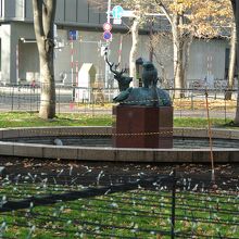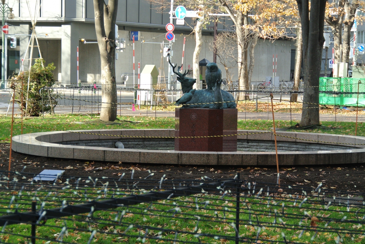 鹿とウサギとフクロウと、あとはカラス?でしょうか、これらの銅像がなぜ「奉仕の道」なのかはわかりませんが、予備知識なしで素直にみると、動物たちのかわいい銅像です。大通公園内の丸い池の真ん中に設置されていますが、訪問時池に水はありませんでした。