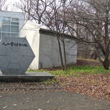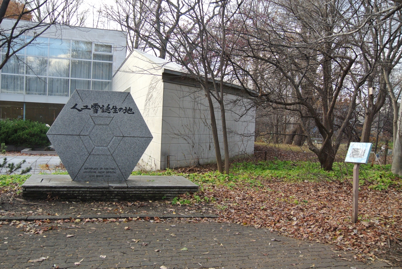 北海道大学のキャンパス内、大野池の横のレストラン前に建っています。人工雪誕生の地碑とありますが、実際はその研究を行った中谷宇吉郎博士の顕彰碑なのかなと思います。雪の研究を行った物理学者ですが、「立春の卵」「雪は天からおくられた手紙である」というような随筆家としてのイメージが強いです。碑も雪の結晶をイメージしているようです。