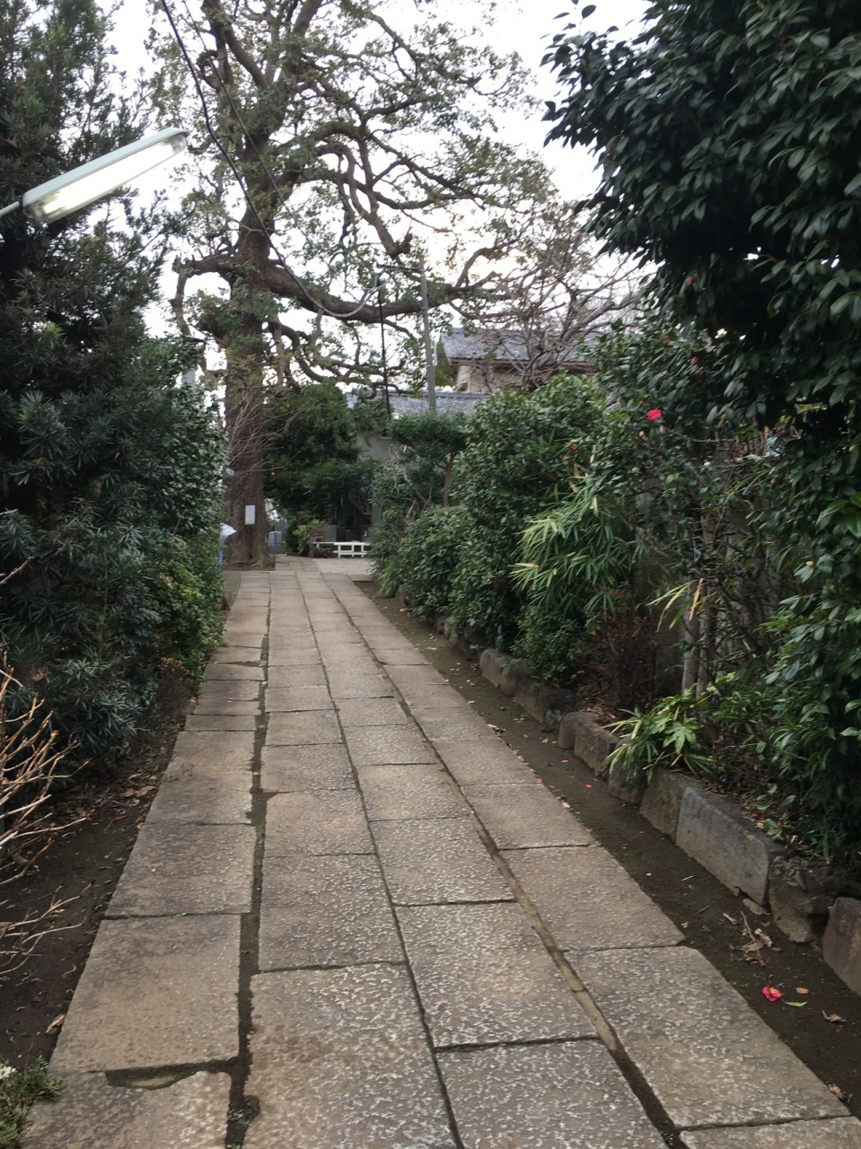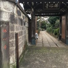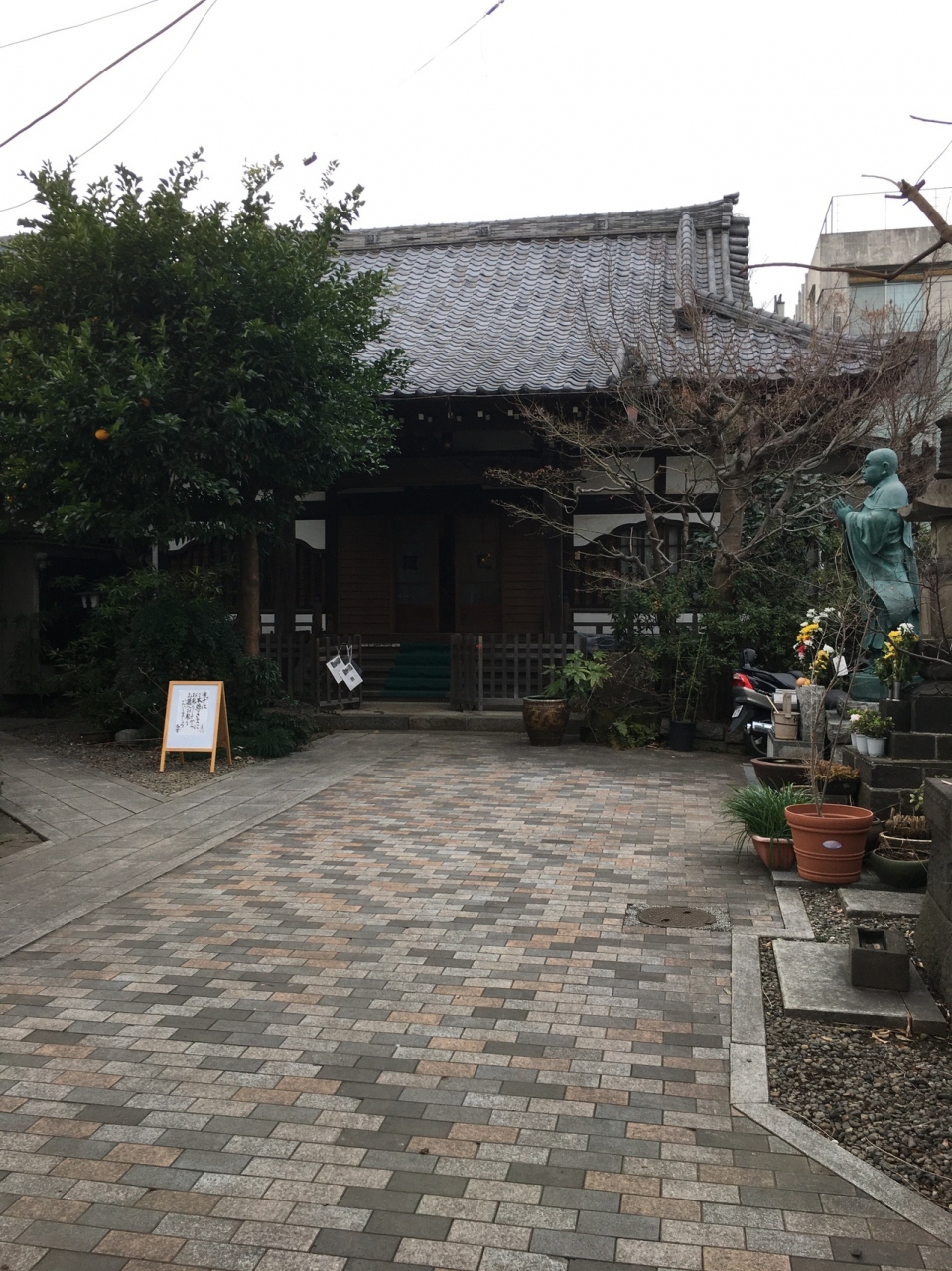 山門の左右は、ブロックは細い出入口です。山門は古い木で瓦屋根でした。山門を潜ると長方形の石の地面でした。左右には草木が植えられていました。本堂の横には、お坊さんの像があり、手を合わせている姿が印象的でした。