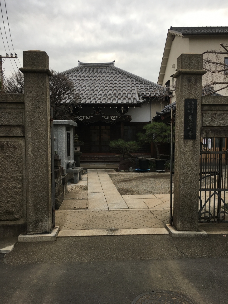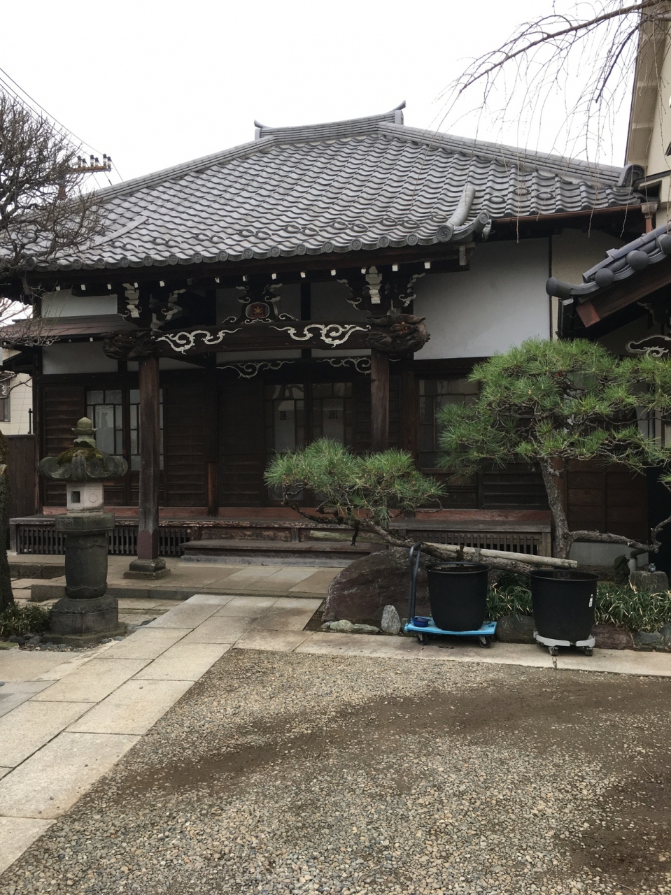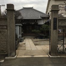 石で出来た門で、扉は黒い自宅にあるような扉でした。長方形の石と砂利の地面の境内で、灯篭と、盆栽を大きくしたような松の姿が良かったです。木も立っていましたが葉がなかったので少し寂しさを感じる光景でした。