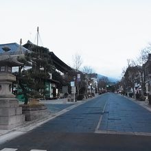 JR長野駅善光寺口から徒歩20分ほどにある善光寺前にある仲見世通りです。善光寺の山門を向こうに見ながら真っすぐ延びる石畳、両脇には色々な土産物店や飲食店が軒を連ねいて、通りを散策するだけでも楽しめます。