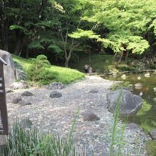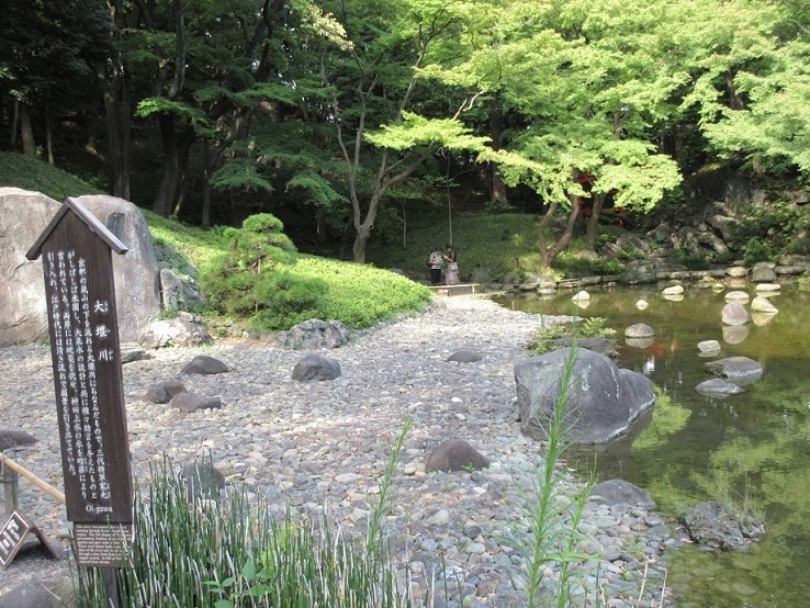 京都の嵐山にある大堰川に因んで造成されたものとのことですが、川というより沢と呼ぶ方が相応しい小さな流れでした。通天橋方面に向かって歩いていくと渡ったのですが、細長い池といった程度の水量でした。でもそれを川に見立てて、かつての大名は楽しんだのでしょう。「川」にはいくつもの石が置かれていて、それらしく見せていました。